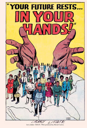 The ones from then 1950s show variations on the classic “nuclear family,” and how voting or not voting impacts their lives. Most are straightforward but the first two above are a little more cartoony, if no less truthful. The last few appeal to the black voter of the 1960s, with one even being a little-known Marvel comic book, produced by Larry Lieber and looking for all the world like a Marvel superhero could show up in any panel at any moment.